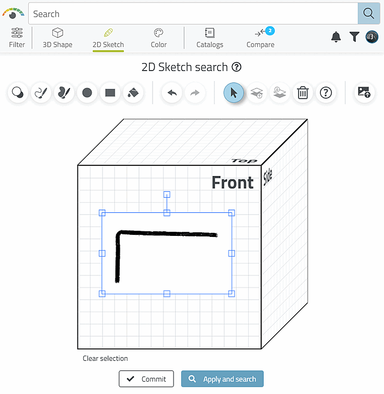 -> La recherche d'esquisse 2D [2D Sketch search] avec le cube pour la saisie de 3 esquisses maximum s'ouvre.
