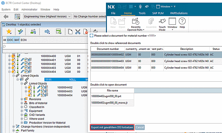 Dans la boîte de dialogue ouverte, sélectionnez la ligne de tableau avec le numéro de document souhaité et cliquez sur Continuer l'exportation avec le DIS sélectionné [Continue export with chosen DIS].