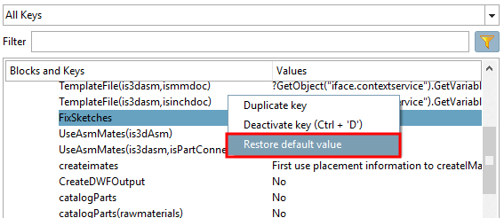 Restaurer la valeur par défaut [Restore default value]: Dans le menu contextuel de chaque clé, vous trouverez la commande Restaurer la valeur par défaut [Restore default value].