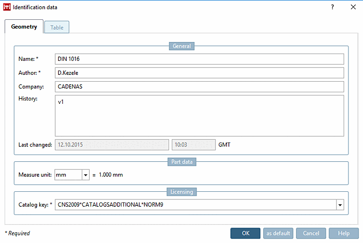 Toutes les entrées dans les champs peuvent être enregistrées comme préréglage [as default] pour d'autres éléments de construction (fichier [File] → Nouveau [New] ) via le bouton du même nom - par exemple si le nom de l'entreprise ou l'auteur doivent être conservés.