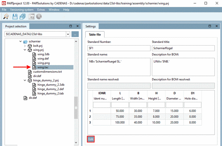 In PARTproject, mark the file "hinge_dummy.tab" and in the docking window Settings, click on .