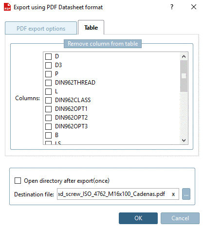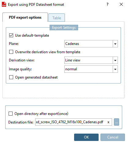 .-> The dialog box Export in PDF datasheet format opens onto the PDF export options tabbed page.