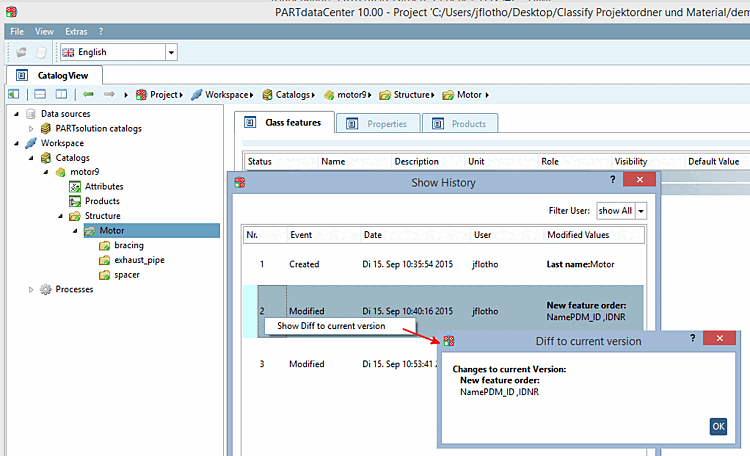 Afficher l'historique [Show change history]: Toutes les modifications de classe sont affichées (nom, description, caractéristiques de la classe).
