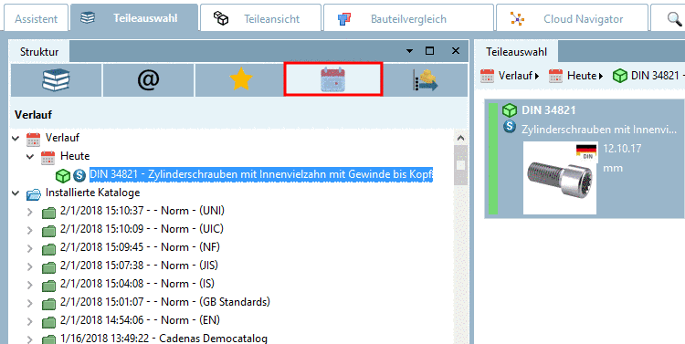 When selecting the item History the subitems Today, Last week, etc.) and Installed catalogs are displayed.