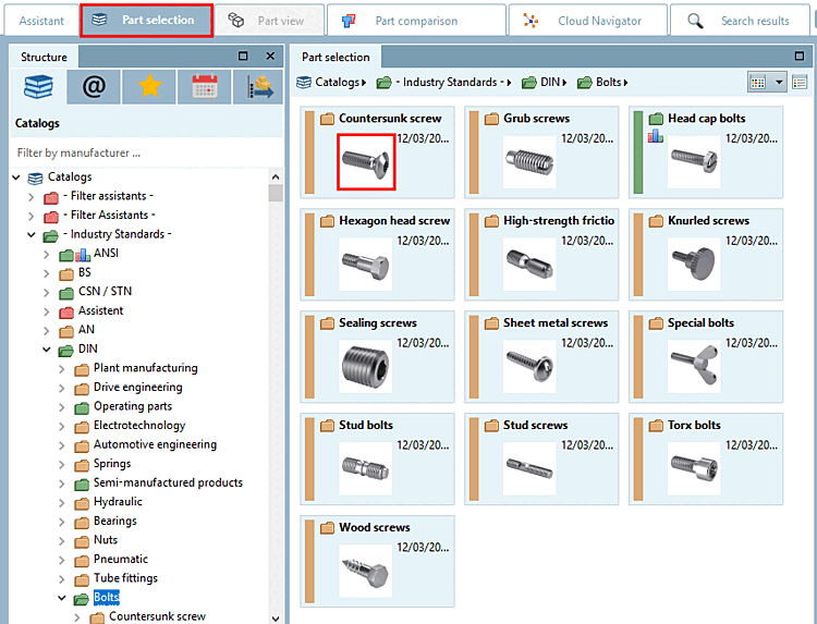 En cliquant sur un lien, la pièce s'ouvre dans la sélection de pièces [Part selection], dans la structure de classification.