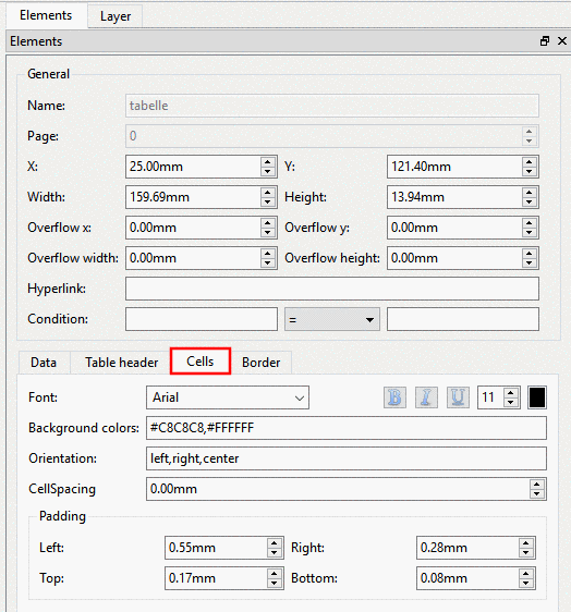 For the design of the font in the table header there are setting options such as Font (also see Section 10.4.5, “ Text ”), Font size, font color, bold, italics and underlined available.