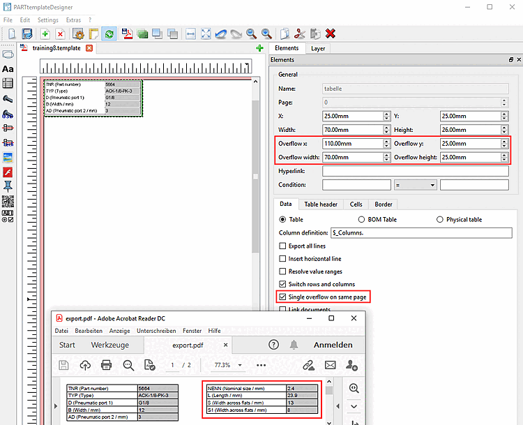 L'option Débordement unique sur la même page [Single overflow on same page] permet de diviser un tableau et de placer les deux parties l'une à côté de l'autre. Le tableau ne peut déborder qu'une seule fois sur la même page.