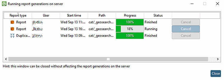 -> La génération du rapport est lancée. La boîte de dialogue Générations de rapports en cours sur le serveur [Running report generations on server] vous informe de la progression.