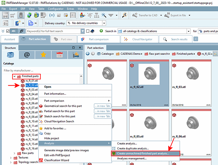 Dans cet exemple, il s'agit de trouver des pièces brutes appropriées pour une certaine pièce finie. Sélectionnez donc une pièce finie et cliquez sur la commande du menu contextuel Analyse [Analysis] -> Créer une analyse des ébauches / pièces finies.... [Create unmachined/finished part analysis...]