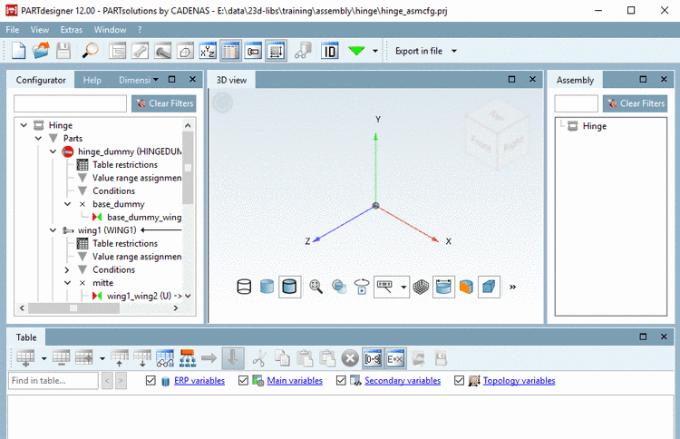 -> The docking windows Table and 3D view are still empty. In the docking window Assembly, initially only the assembly's name is displayed.