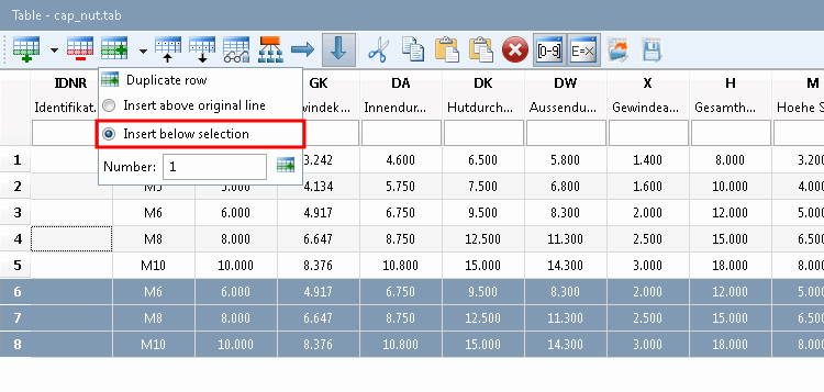 Dupliquer la ligne [Duplicate row] peut être utilisé avantageusement lorsque les lignes présentent de nombreuses similitudes. Ainsi, vous ne devez adapter que quelques cellules.