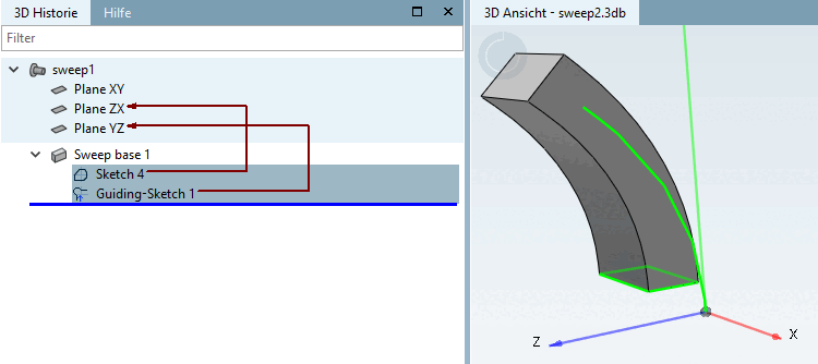 Il est également possible de ne sélectionner au départ que l'esquisse de la section transversale, puis, sur la page d'onglet Tracé de base [Sweep base], la courbe de tracé correspondante dans la zone de liste (si plusieurs sont disponibles).