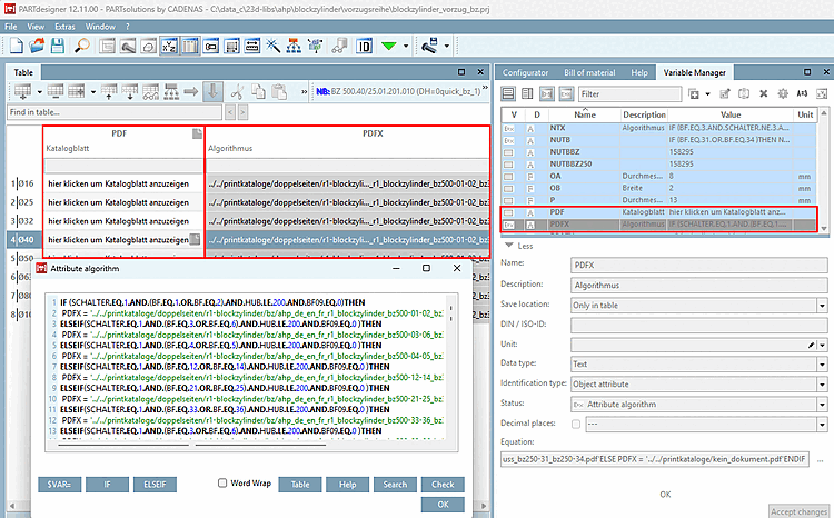 Document à ouvrir [Document to open]: indication de variable qui se réfère à une URL avec prise en compte de la dépendance linguistique. Une condition correspondante est formulée en fonction de $CADENAS_LANGUAGE.