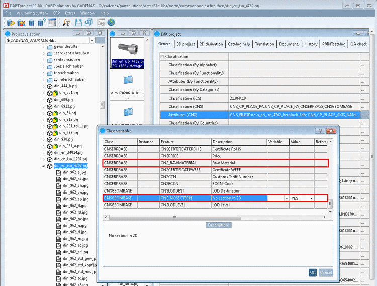 The desired attributes are set in PARTproject under Edit project -> General -> Classification > Attributes (CNS) -> feature CNS_NOSECTION or CNS_RAWMATERIAL.