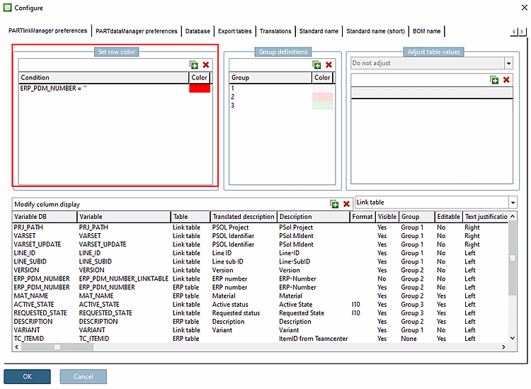 Interface utilisateur : PARTlinkManager -> Menu Extras -> Configurer [Configure] dialogue -> Onglet Paramètres PARTlinkManager [PARTlinkManager preferences] -> Définir la couleur de la ligne [Set row color] -> Entrée "ERP_PDM_NUMBER".