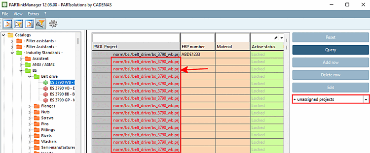 Tableau PARTlinkManager: Si le numéro ERP manque, le chemin du projet sous PSOL Projet [PSOL Project] est affiché par défaut en rouge. L'option de la zone de liste + projets non référencés [+ unassigned projects] doit être sélectionnée.