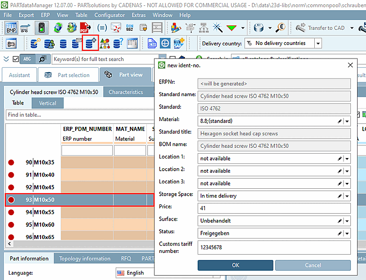 Le blocage a lieu temporairement pendant 30 minutes ou tant que la boîte de dialogue Nouveau numéro d'identification [new ident-no.] est ouverte dans le PARTdataManager.