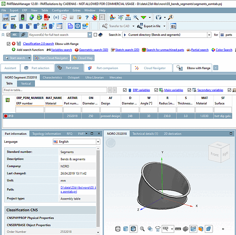 Sélectionnez dans l'arbre d'index une pièce propre Class 2.0 appropriée (ici dans l'exemple "coude de tuyau avec bride").