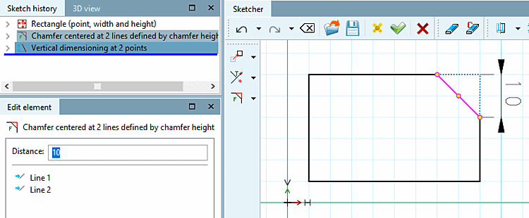 (L'ordre ne fait pas de différence.) Le placement du chanfrein en dehors de la forme est réalisable, voir à ce sujet le paragraphe Chanfrein centré sur 2 lignes par la distance à l'intersection [Chamfer centered at 2 lines defined by distance to intersection].