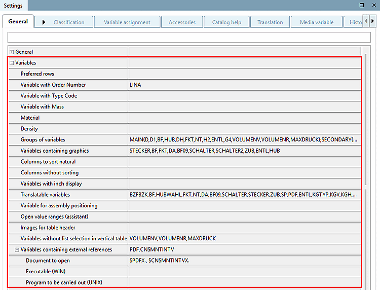 Les entrées suivantes sont automatiquement mappées sur les variables de classe [Class variables] correspondantes de la classification CNS et ainsi transmises à la CAO lors de l'exportation des pièces. Voir aussi Section 5.12.3.1.10, « Attribuer facilement des variables importantes à la classification CNS ».