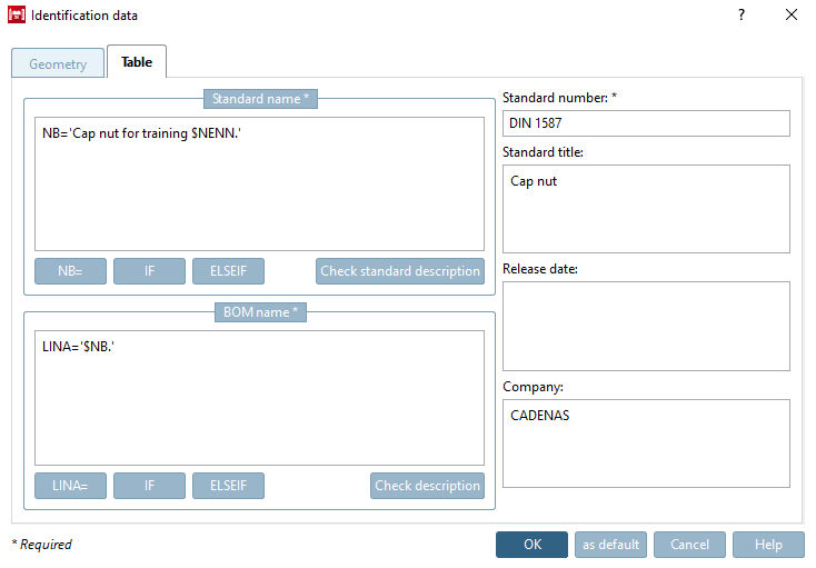 Remplissez les champs obligatoires Désignation de la norme [Standard name], Désignation de la nomenclature [Description for BOM] et Numéro de la norme [Standard number]. Vous trouverez des détails à ce sujet sur ???.