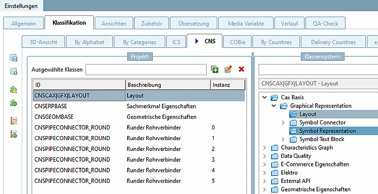 Pour le référencement des symboles, la classification CNS met notamment à disposition les classes CNSCAX|GFX|1 (connexion des symboles) et CNSCAX|GFX|SYMREP (représentation des symboles), ainsi que la classe CNSCAX|GFX|LAYOUT. Vous trouverez des explications sur la distinction entre les deux modèles de données sous Section 5.12.10.2, « Classer les symboles (DXF/DWG) comme "Formats d'exportation supplémentaires" (manuellement) ».