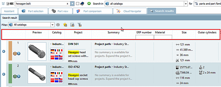 Toutes les variables de tous les tableaux ont leur propre colonne. (En faisant défiler vers le bas, il est probable que de plus en plus de colonnes apparaissent). Cela peut éventuellement conduire à des tableaux très larges (si la recherche porte sur de nombreux catalogues ou si les pièces sont structurées différemment). Par exemple, pour les diamètres de filetage, il se peut que l'on ait utilisé une fois "D" et une fois "D1".