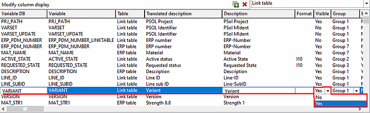 Visibilité des colonnes dans le PARTlinkManager