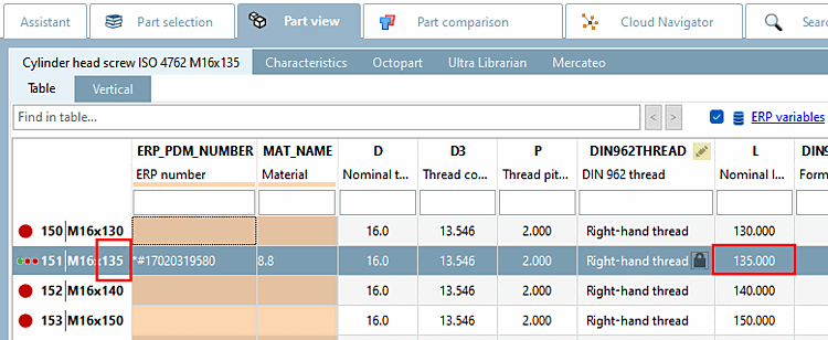 Comme résultat, la variante créée est en plus affichée dans le PARTdataManager.
