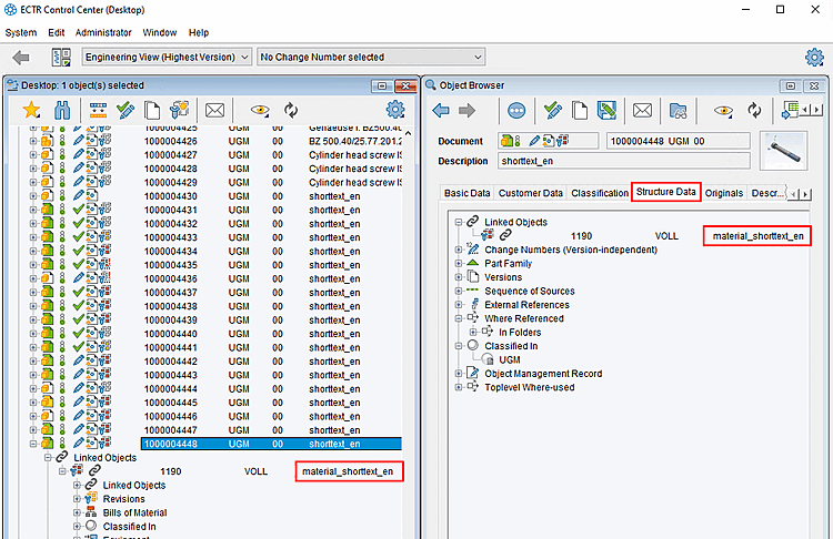 Si un document est sélectionné, vous trouverez le résultat pour la désignation de l'article dans SAP ECTR Desktop > document spécifique > objets liés et dans Object Browser > page à onglet Structure Data > Linked Objects.