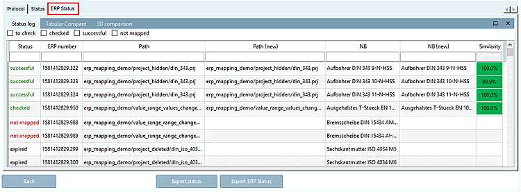 Le statut (vérifié [checked], réussi [successful], expiré [expired] et non mappé [not mapped] ) est affiché pour tous les numéros ERP concernés, ainsi que le chemin [Path], le chemin (nouveau) [Path (new)], NB et NB (nouveau) [NB (new)].