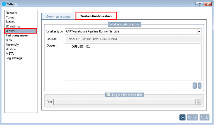 Limite de mémoire pour le redémarrage du worker [Memory limit for worker restart]: la valeur devrait être augmentée ici, surtout si la conversion est effectuée avec un système de CAO. Un indice que le job n'a plus de mémoire est le message suivant dans le worker : "Controller said kill job...