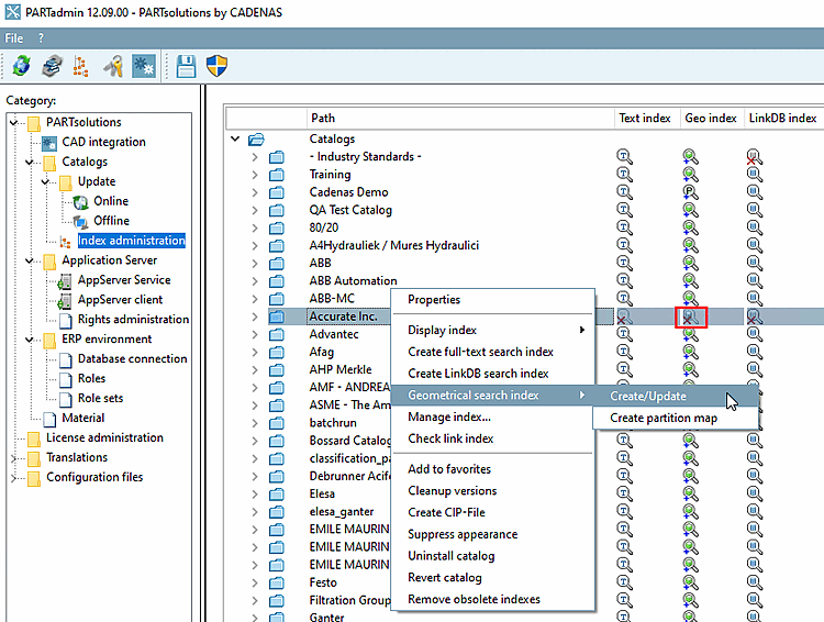Index de recherche géométrique manquant [Geometric search index is missing]: Utiliser la commande du menu contextuel Index de géolocalisation [Geometrical search index] -> Créer/Mettre à jour [Create/Update]. |