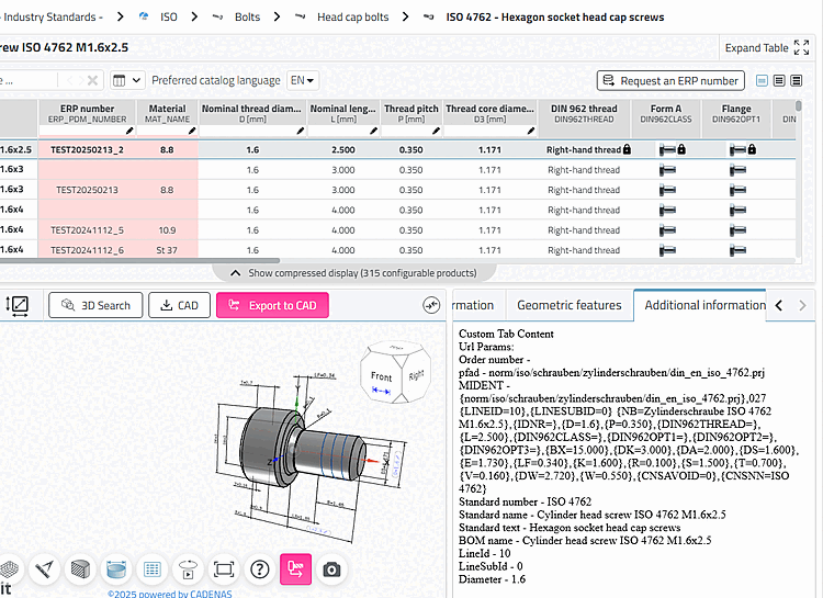 $CADENAS_SITESETUP/3df/pluginsun nouveau fichier HTML « tabContent.html » et copiez le contenu suivant dans. Si le dossier n’existe pas, créez-le.<!DOCTYPE html> <html lang="en"> <head> <meta charset="utf-8" /> <meta http-equiv="X-UA-Compatible" content="IE=edge" /> <meta name="viewport" content="width=device-width, initial-scale=1" /> </head> <body> <div>Custom Tab Content</div> <div>Url Params:</div> <script> window.addEventListener("load", () => { const queryParams = new URLSearchParams(window.location.search); queryParams.forEach((value, key) => { const div = document.createElement("div"); div.textContent = `${key} - ${value}`; document.body.appendChild(div); }); }); </script> </body> </html>L'onglet devrait maintenant s'afficher dans 3Dfindit.