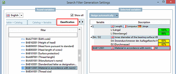 Parfois, des noms de variables différents sont utilisés pour la même caractéristique géométrique (les illustrations suivantes montrent par exemple DA et D2). Il est donc particulièrement intéressant de regrouper différentes variables dans un seul filtre dans l' assistant de filtre de recherche [Search filter assistant] et d'adapter le nom du filtre en conséquence.
