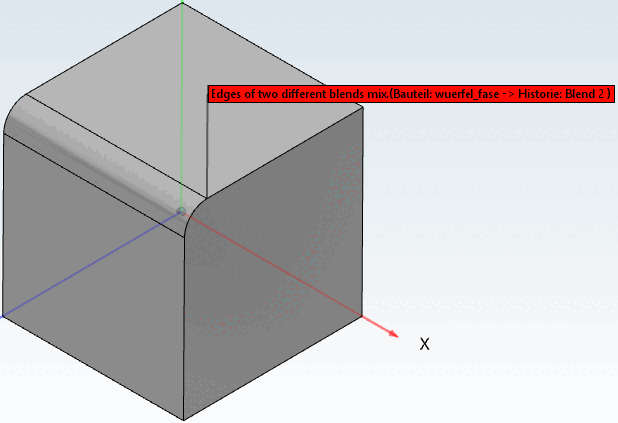 Tous les chanfreins/arrondis dont les arêtes se rencontrent doivent être créés dans UNE fonction de fusion. La commande Créer un nouveau chanfrein/arrondi [New Chamfer/Fillet...]... ne peut donc être utilisée qu'initialement. Pour les blends suivants, la commande Ajouter arête(s) à 'Blend xy'... doit être utilisée, sinon un message d'erreur apparaît - même si les chanfreins ou les arrondis ont la même taille (voir les illustrations suivantes).