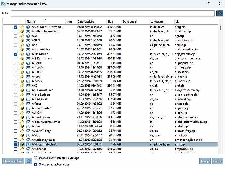 $CADENAS_USER/partupdate_cacheCache. Il contient toutes les images, les notes de version et Listes de pièces des catalogues déjà téléchargés. Fichiers CIP ne sont pas mis en cache, car ils sont de toute façon trop volumineux are.... : En cliquant sur le bouton, vous ouvrez l'éditeur du même nom. Déterminez une option parmi Ne pas afficher les catalogues sélectionnés [Do not show selected catalogs] et Afficher les catalogues sélectionnés [Show selected catalogs] et activez les catalogues souhaités.