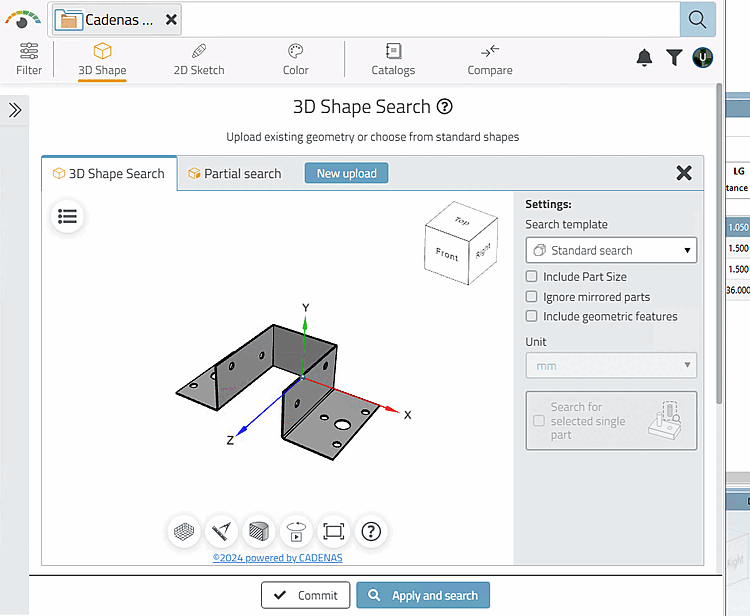 Vous pouvez à tout moment élargir la recherche par des caractéristiques géométriques [Geometric features] (perçages, motifs, surfaces cylindriques ou planes, taille de la pièce, etc. Voir Section 5.5.2.5, « Recherche avancée de caractéristiques géométriques » in ENTERPRISE 3Dfindit.