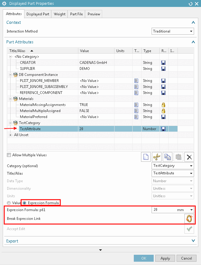 Le proxy CAO NX peut lire les unités, la catégorie et la formule d'expression de chaque attribut de modèle et, si cela est autorisé, écrire la catégorie et la formule d'expression.