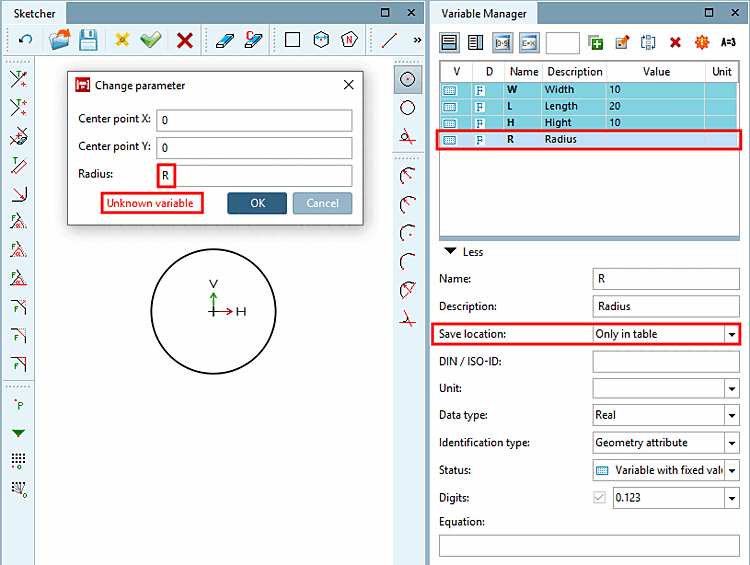 Si vous avez créé une variable avec l' emplacement [Save location] "Seulement dans le tableau [Only in table]" (enregistrement dans le fichier tab/tac) et que vous souhaitez l'utiliser dans Sketcher, le message d'erreur Variable inconnue [Unknown variable] apparaît.