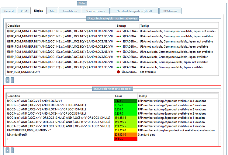 Pour le rôle "DUMMY", il existe des entrées sur la page d'onglet Affichage [Display] sous Couleurs d'état pour l'index du catalogue [Status colors for catalog index]. Cela signifie que les couleurs suivent la condition saisie ici, ce qui annule la couleur verte/semi-transparente standard.