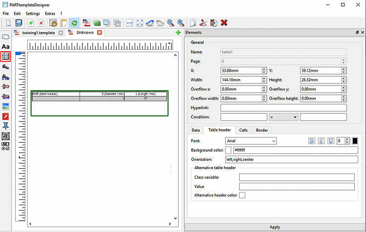 Pour la mise en forme de la police dans l'en-tête du tableau, des options de réglage sont disponibles comme la police [Font] (voir aussi Section 8.4.5, « Texte »), la taille de la police [Font size], la couleur de la police, le gras [bold], l'italique [italics] et le souligné.