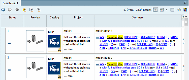 Si, par contre, vous ne souhaitez obtenir que des résultats avec "Stainless steel", c'est-à-dire exclure par exemple les résultats avec "Steel" seul, combinez la recherche par expression et la recherche stricte [Strict search].