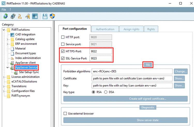 In PARTadmin under AppServer Service you can find the setting options concerning Authentication, Assign rights and Rights. Also important is to use HTTPS / SSL for the Port configuration (see below).