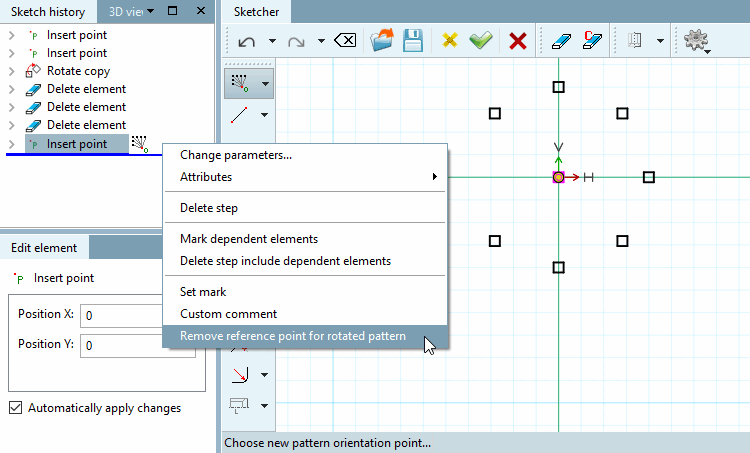 Le point peut être supprimé via la commande Supprimer le point de référence pour le motif de rotation du [Remove reference point for rotated pattern] menu contextuel.