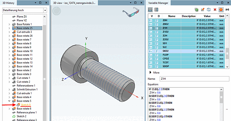 La sélection des variables Z1H l’esquisse concernée devient jaune dans l’historique 3D [3D History]
