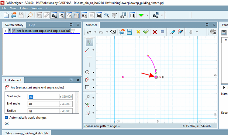 Le balayage est maintenant créé à partir de l' esquisse de départ [Start sketch] et du tracé [History].