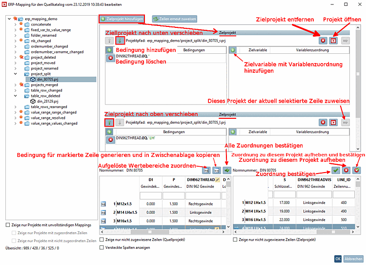 Dans l'arborescence du répertoire, on voit immédiatement quels projets ont été entièrement mappés (ceux-ci n'affichent pas de symboles) et quels projets ont certes été mappés automatiquement, mais doivent encore être vérifiés (et éventuellement édités).