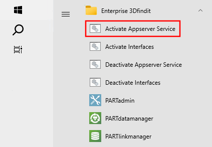 Il n'est pas nécessaire de configurer manuellement PARTapplicationServer en tant que service. Après l'installation du package MSI PARTsolutions Enterprise, vous trouverez dans le menu de démarrage l'entrée Activate Appserver Service (désactiver le service Appserver ).