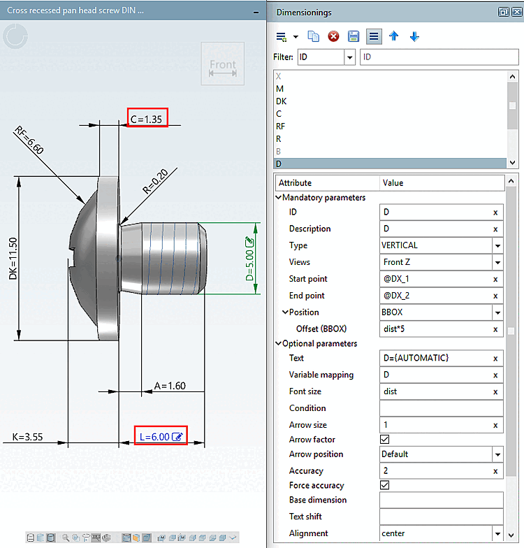 Si vous saisissez un ID d'un élément de cotation sous Dimension de base [Base dimension], la valeur indiquée sous Position -> Cote d'écartement ne se réfère pas à la bounding box, respectivement à l'élément, mais à l'élément de cotation indiqué.